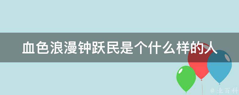 血色浪漫钟跃民是个仗义胆大、脑子好使、身体强壮、嘴皮子厉害、心胸开阔的人。钟跃民是电视剧《血色浪漫》剧中男一号,由著名演员刘烨扮演。剧情故事发生于1966年左右,钟跃民是一个成长于机关大院的青年,思想敏锐,经历丰富,是建国初期的典型青年代表,他混过街、刷过夜、插过队、当过兵、进过局,哥们儿义气重,好交朋友,为人耿直。