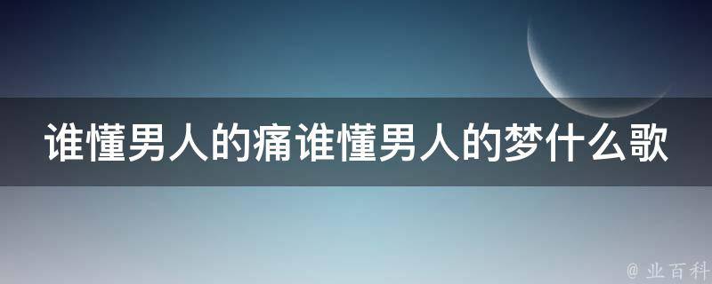 谁懂男人的痛谁懂男人的梦是歌曲《男人的痛》。《男人的痛》是MC驱弟于2017年1月自行录制的一首音乐作品。歌词节选:谁懂男人的痛,谁懂男人的梦,谁会知道男人一生有过多少感动。我们也会流泪,我们不想喝醉,没有一个男人喜欢酒精麻痹滋味。