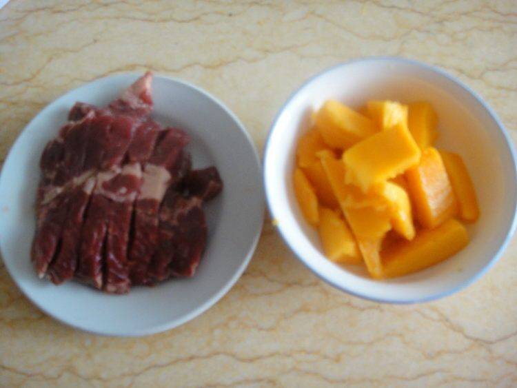 1、食材准备:牛排150克、芒果200克、芦笋2根、橄榄油、盐、彩椒、水淀粉各适量。