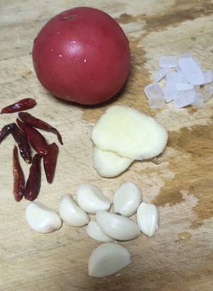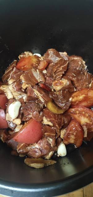 1、准备材料:牛肉适量、姜3片、生抽3勺、老抽1勺、冰糖适量、料酒2勺、西红柿1个、红辣椒6个、蒜瓣适量。