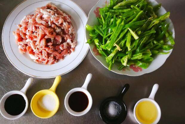 瘦肉280克、青椒300克、生抽10克、香醋8克、盐7克、白糖3克。