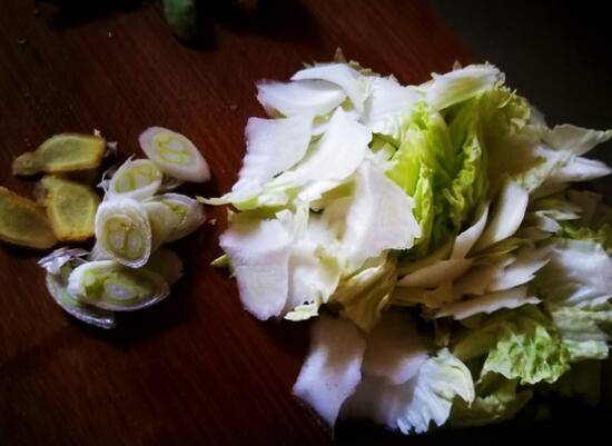 2、白菜,葱姜分别切片。