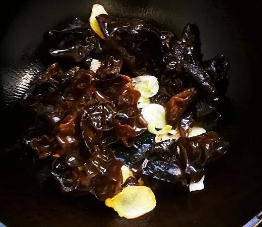 3、热锅凉油煸香葱姜后下入木耳翻炒。