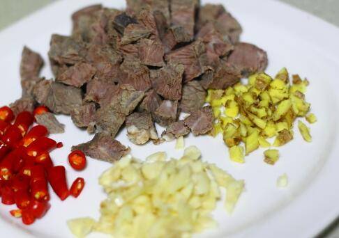 牛肉切丁、小米辣、生姜、蒜分别洗净后切碎。