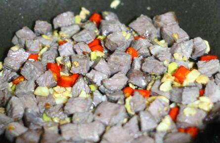 炒出蒜香味后加入牛肉和小米辣一起翻炒,小火慢慢翻炒至牛肉表面微黄。