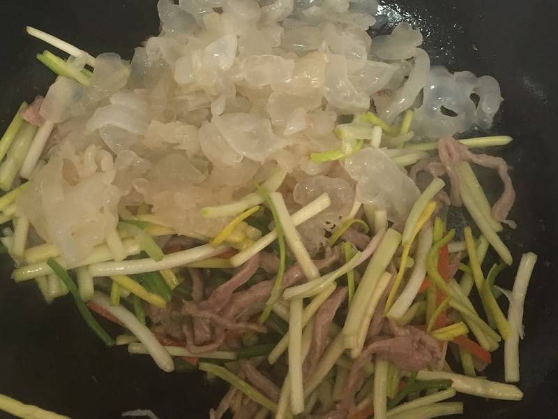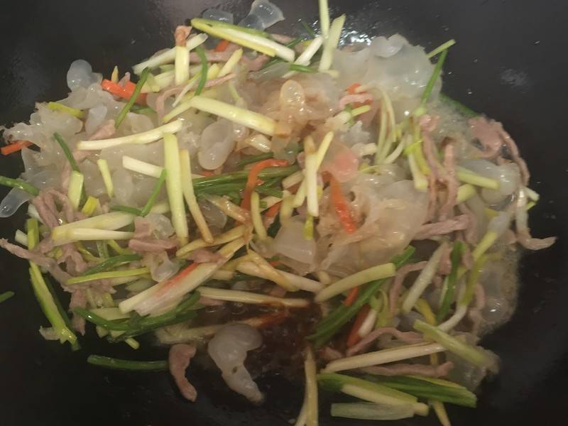 用料:猪肉、胡萝卜、蒜黄、香菜、海蜇、生抽、料酒、淀粉、香油、花生油。