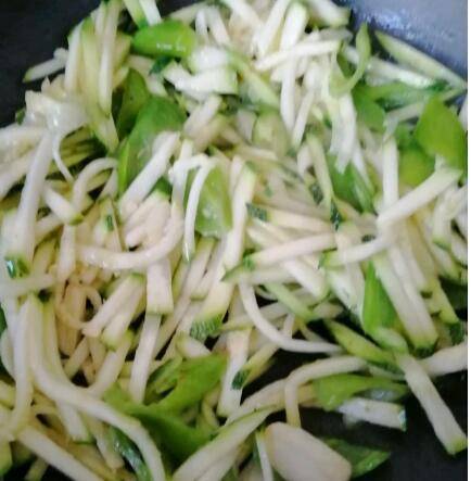 4、放青辣椒,小南瓜翻炒,放盐,起锅时再放入味精即可。