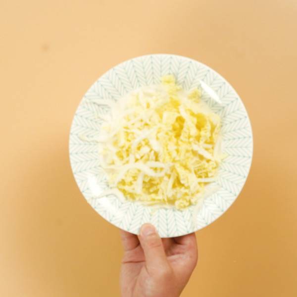 2、香菜切丝,大蒜切末,白菜切丝,胡萝卜切丝,黄瓜切丝。
