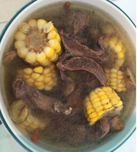 1、准备食材:猪心玉米、枸杞。猪心切片,洗干净,注意要把上面黑色的血洗了,买了的时候这么血由于血小板的作用应该已经凝固了,别把它认为是肉了。不然等下煮成一锅红色,虽然挺漂亮,味道可不敢保证。