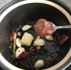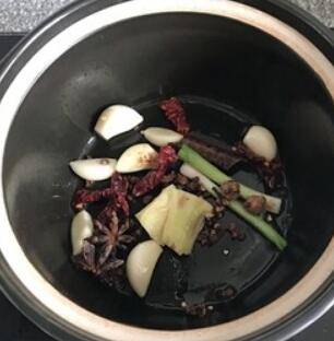 3、砂锅放油,放葱、姜和蒜、香料炒香。