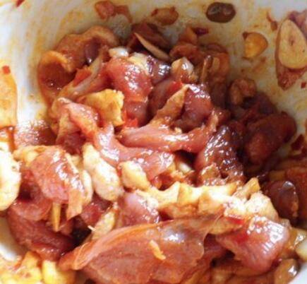 2、将鸭脯肉切薄片,鸭肉放碗里,用豆瓣酱、蚝油、食盐、料酒、蒜片拌均腌制15分钟。