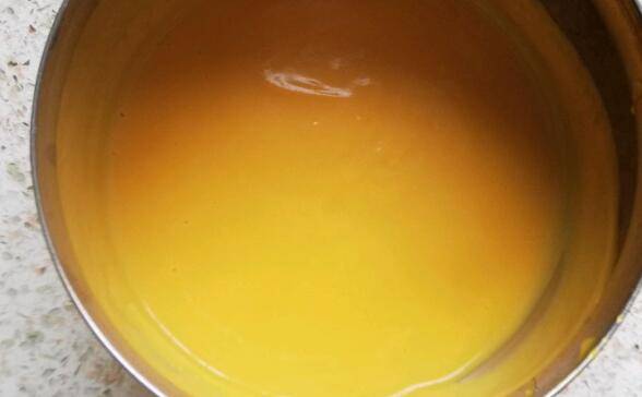 6、将打好的南瓜糊倒进奶锅中,小火加热, 南瓜糊烧至浓稠时,倒入淡奶油。