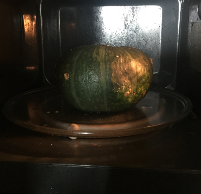 1、将一整个贝贝南瓜在微波炉中加热8分钟左右至熟。可以分多次叮,变化南瓜位置使其受热均匀。