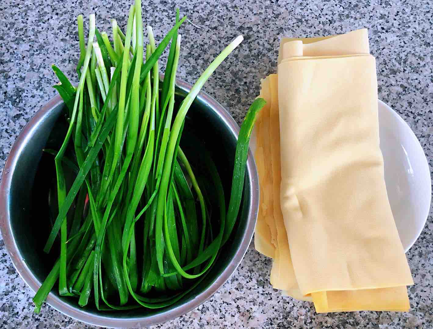 2、韭菜摘好洗净切段。