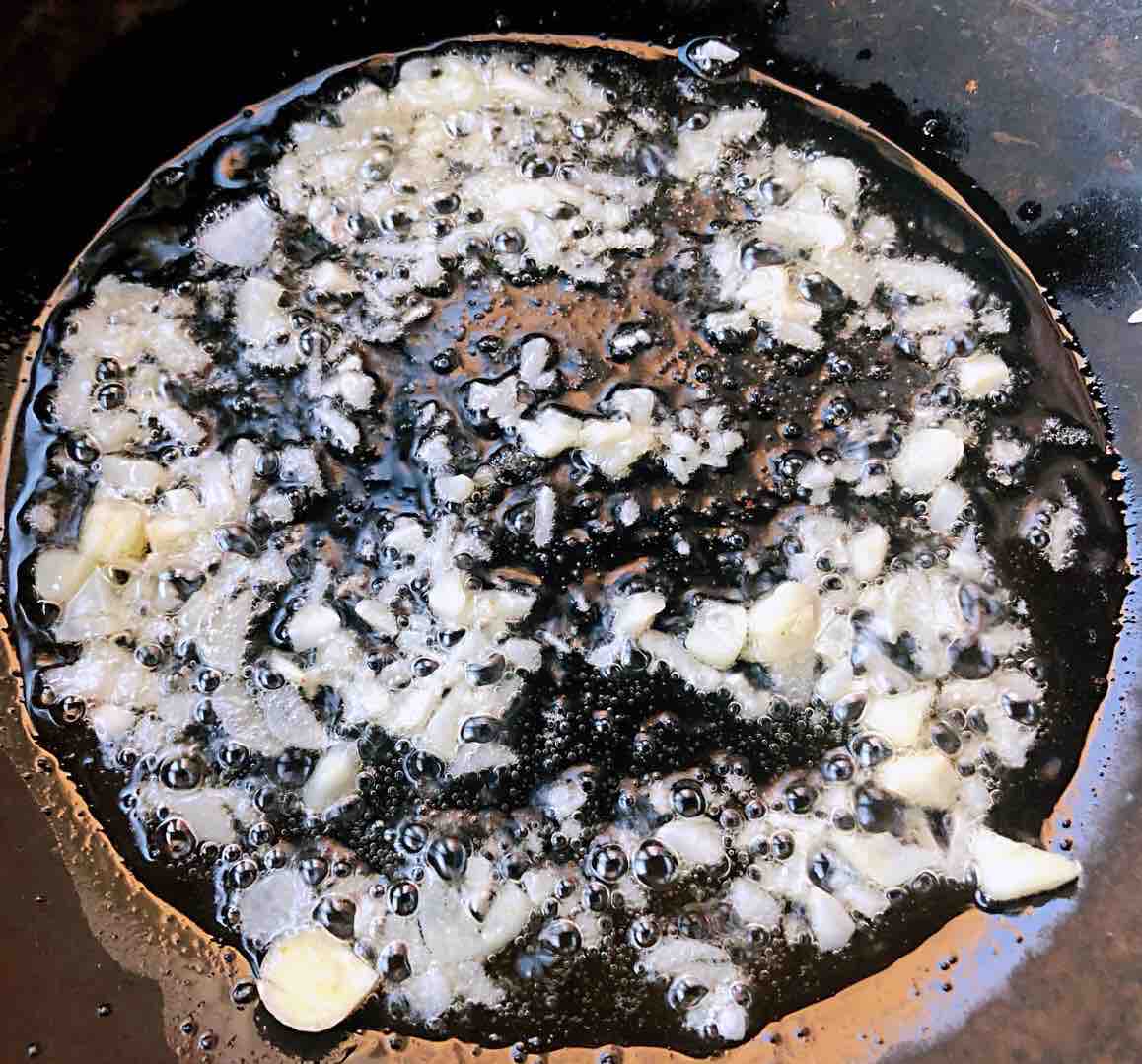 6、锅中倒入底油加热放入蒜粒爆香。