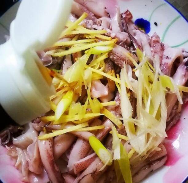 3.葱姜切丝和鱿鱼一起加入料酒,白胡椒搅拌均匀腌10分钟。