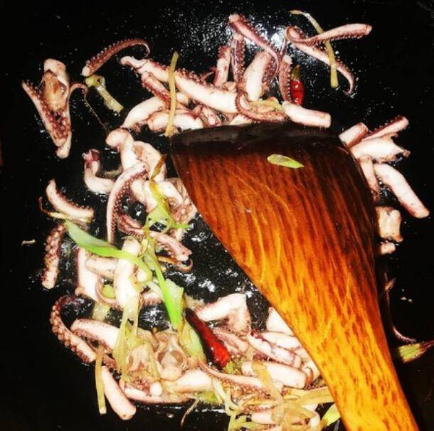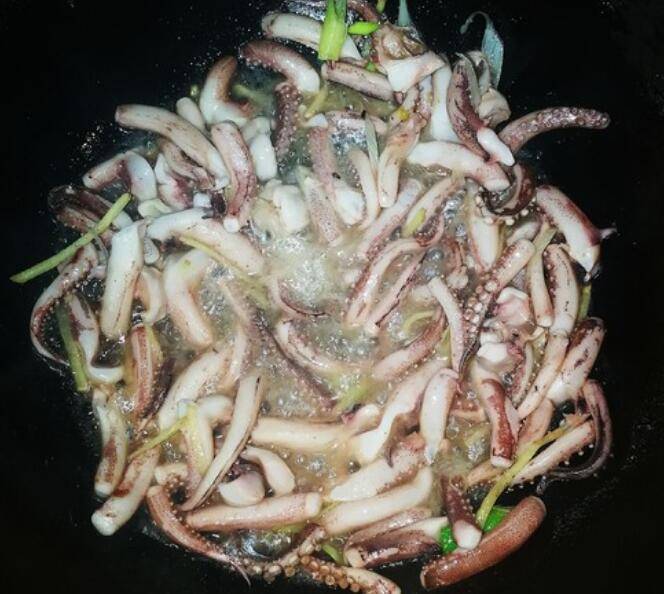 5.另起锅烧热油,煸香葱姜干辣椒,放鱿鱼翻炒几下,加入料酒、生抽、蚝油、盐、翻炒均匀。
