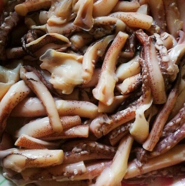 1.鱿鱼须清水洗净,去除杂质后切成段。