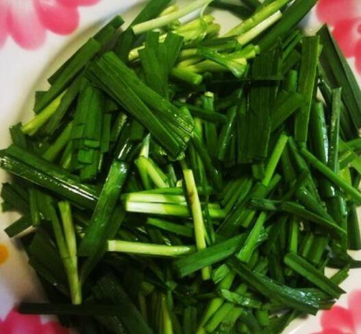 6.倒入韭菜翻炒几下即可。