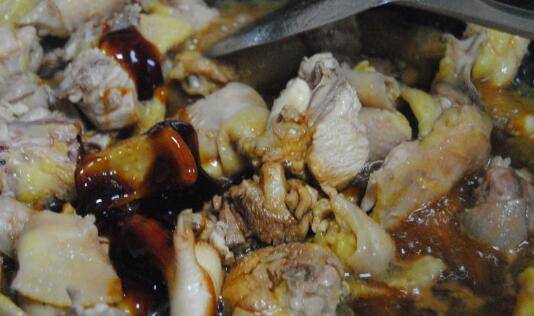 放入姜片爆香,倒入鸡块快速翻炒均匀,倒入料酒翻炒至冒酒香,鸡块慢慢煸出油。