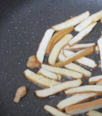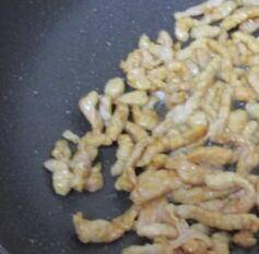 2、热锅倒入油,温油把猪肉丝入锅煸炒至全部变色后捞起。