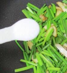 4、再把韭菜苔入锅不断的煸炒香味后加盐调味。
