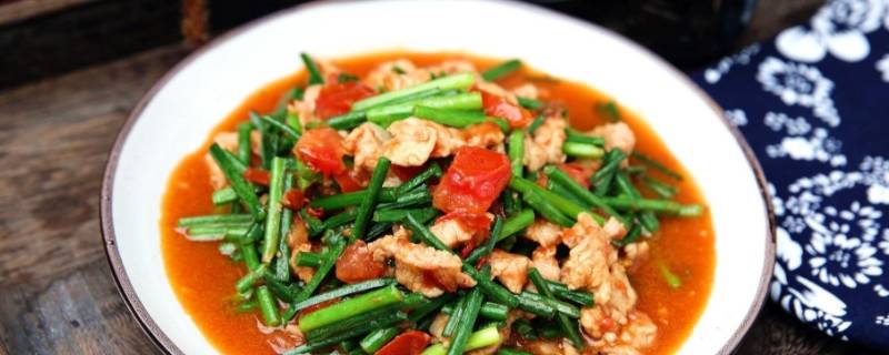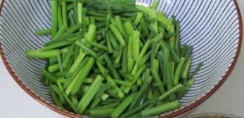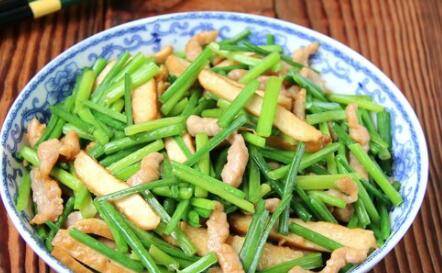 用料:韭菜苔200克、猪腿肉200克、香豆腐干100克、油2汤匙、黄酒1茶匙、盐少许、生粉1汤匙。