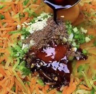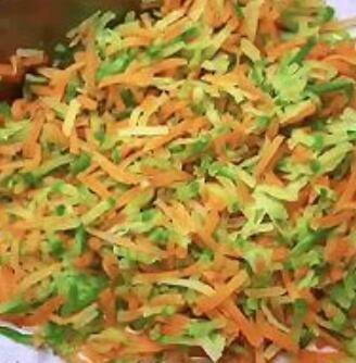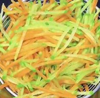 1、青萝卜红萝卜擦丝,水开后烩水30秒。