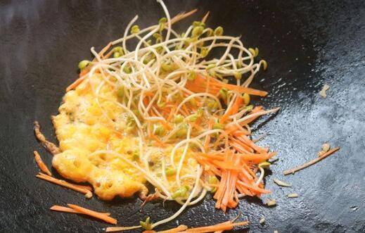 煎出蛋花,豆芽胡萝卜丝下锅炒香。