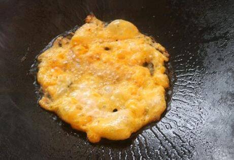 大锅烧热,油热鸡蛋下锅,快速煎成蛋花。
