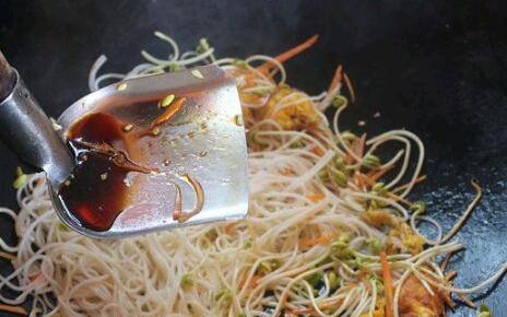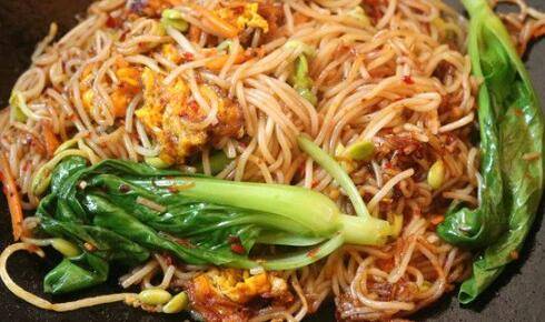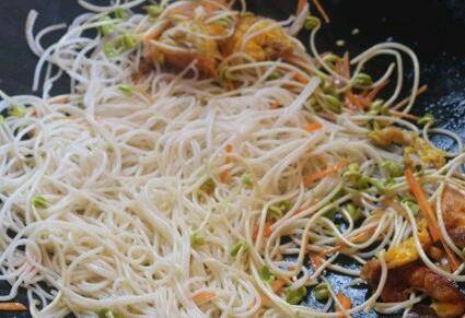 米粉下锅,炒的时候下重油,粉才不会粘连。