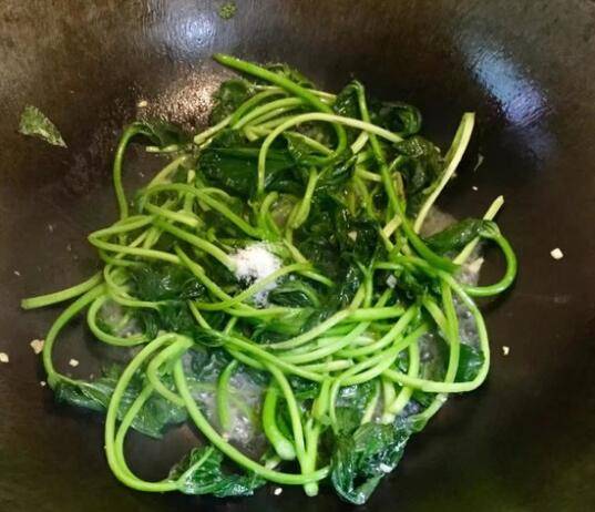 准备食材:薯苗400克、油5克、盐4克、蒜5克。薯苗洗净,蒜子剁成蒜末;热油锅,放入蒜末爆香;放入薯苗,翻炒至软;加入盐调味,在炒2分钟即可。