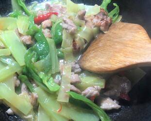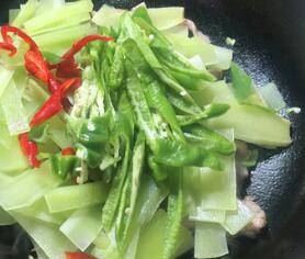 3、莴笋片和辣椒倒入锅中,大火翻炒至莴笋软化。