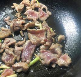 2、锅中热油倒入葱梗煸出香味,倒入肉片快速翻炒至肉片发白,盛出备用。