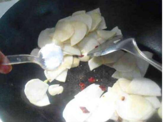 准备食材:红薯200g、食盐适量、调和油适量、红尖椒适量。地瓜剥去皮洗净切薄片;热锅温油放入干红辣椒爆香;倒入地瓜片大火翻炒;加入适量盐炒至地瓜变色即成。