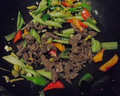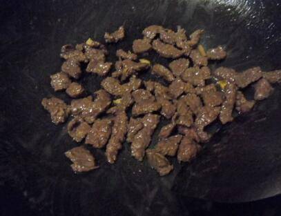 热锅,倒油,放胡椒粉、生姜、把牛肉爆炒熟,起锅。