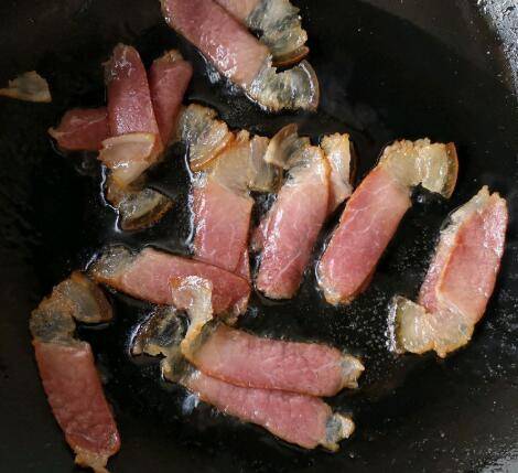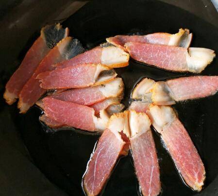 4、腊肉切薄片。锅中少量油,烧热,放入腊肉。