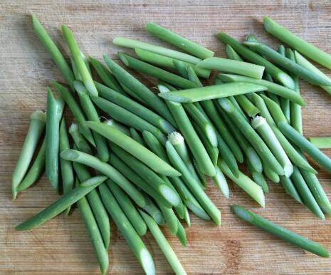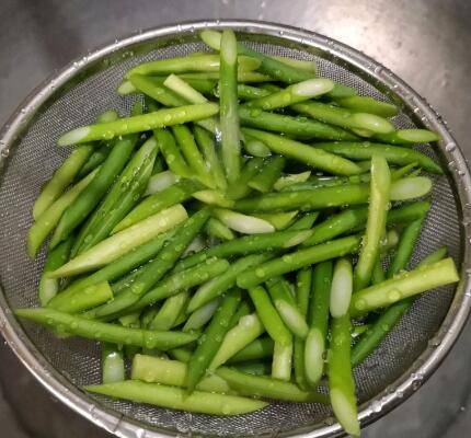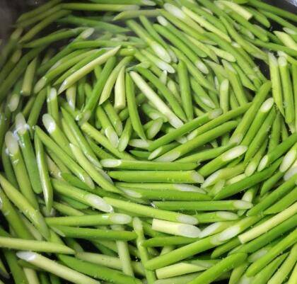 3、过好后把蒜苔过一下凉水,这样会保持蒜苔颜色碧绿。