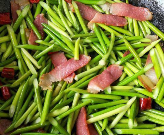 腊肉200克、蒜苔300克、盐适量、干辣椒2-3个、鸡精适量、食用油。