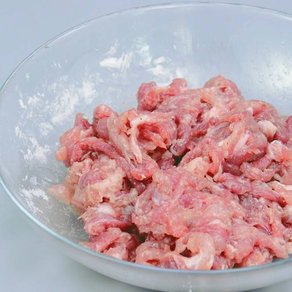 3、猪肉切丝,放入白胡椒粉、盐、淀粉,腌制2分钟。