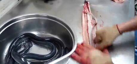 2、从头到尾破开鳗鱼的肚子。