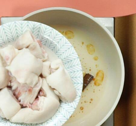 3、食用油5ML,八角1个,桂皮1块,冰糖20克,小火翻炒糖色,倒入猪蹄,小火煎至猪蹄上色。