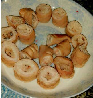 先洗干净猪大肠,放葱和姜片煮,过冷水,切好。