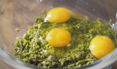 8、锅中倒入适量油,烧至七成热,倒入香椿蛋液。