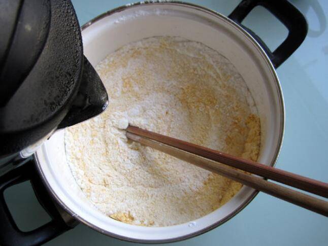 1、玉米面、糯米粉和面粉按3:2:1的比例放入容器中,加入白糖和匀。