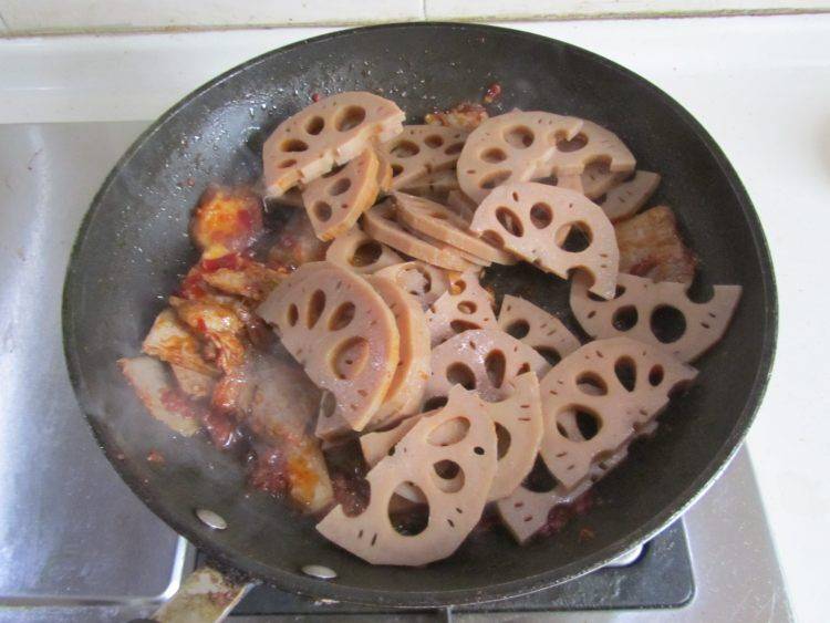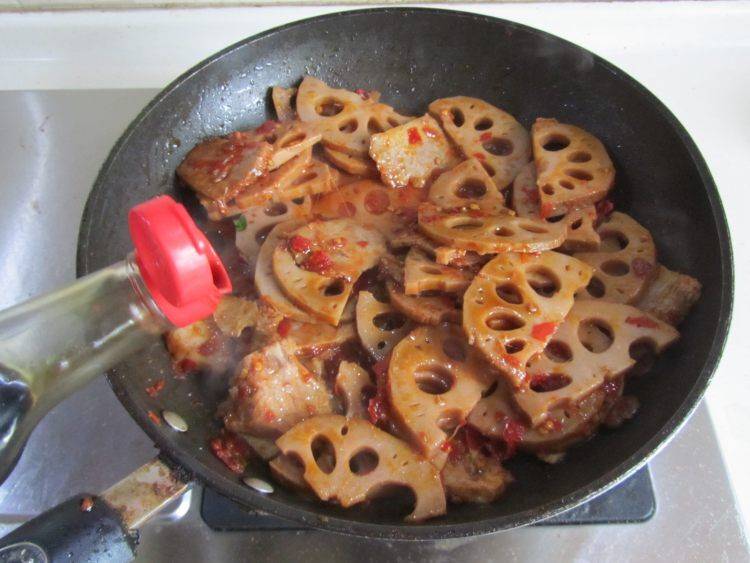 3、炒出红油后下入其它大料翻炒,翻炒出香味后加入适量的水,放入牛肉和藕进去。