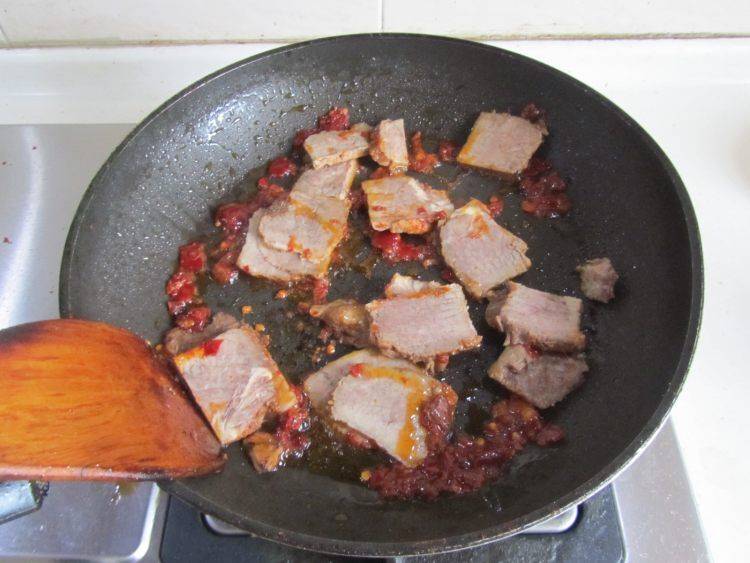 7、烧热锅,放少许油,下入豆瓣酱煸炒。