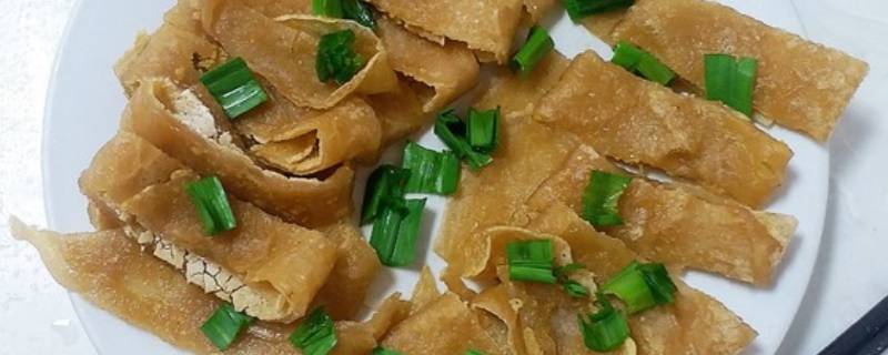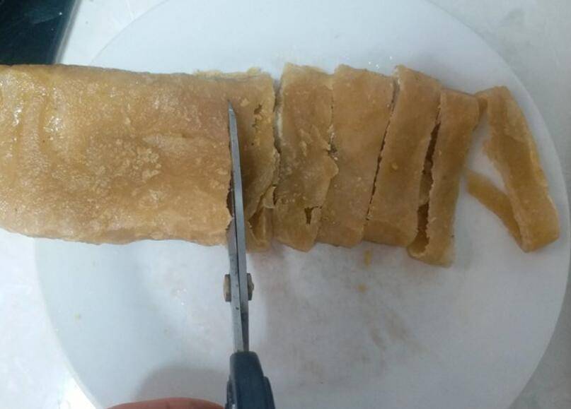 9、卷好的山粉皮用厨房剪或刀切成条,就可以随意当配菜了,也可撒上香葱直接吃。