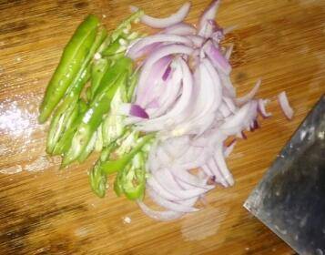 把胡萝卜蒸熟,辣椒洋葱切丝。