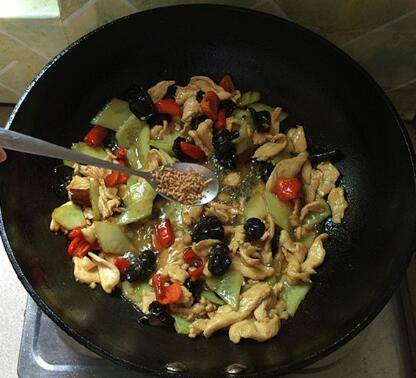 锅中注入食用油,5成热的时候,下鸡胸肉。